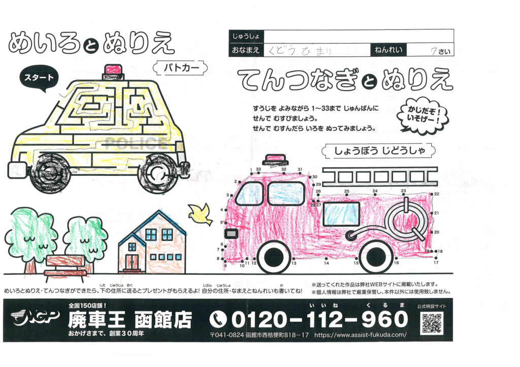 クレヨンかな、温かみのある塗りがいいね!字がとても綺麗だよ!