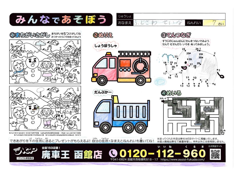 2022年4月14日 / 最終更新日時 : 2022年4月14日 fukuda-admin ぬりえキャンペーン ふじさわせいなちゃん(7さい) 象さんほっぺた赤いのとってもかわいい…。上も下も全部綺麗に塗ってくれててすごくうれしいよ!吹き出しとか色使いとか細かいとこまですごくいいなあ、次も良かったらぜひ参加してね! コメントを残す コメントをキャンセルメールアドレスが公開されることはありません。 * が付いている欄は必須項目ですコメント 名前 * メール * サイト 上に表示された文字を入力してください。