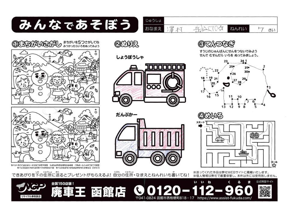 2022年5月11日 / 最終更新日時 : 2022年5月11日 fukuda-admin ぬりえキャンペーン 澤村岳ちゃん(7さい) 杏ちゃんと一緒に参加ありがとう!塗り方がそっくりだね、同じボールペンかな?次は二人のそれぞれの持ち味が感じられる作品待ってるよ! コメントを残す コメントをキャンセルメールアドレスが公開されることはありません。 * が付いている欄は必須項目ですコメント 名前 * メール * サイト 上に表示された文字を入力してください。