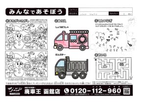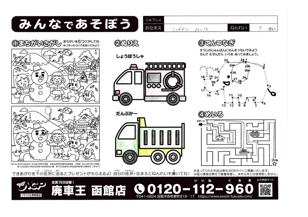 ダンプカーが春っぽい色で素敵!後ろタイヤが白いのもおしゃれだね!めいろもてんつなぎも丁寧でいいよ、参加ありがとう!