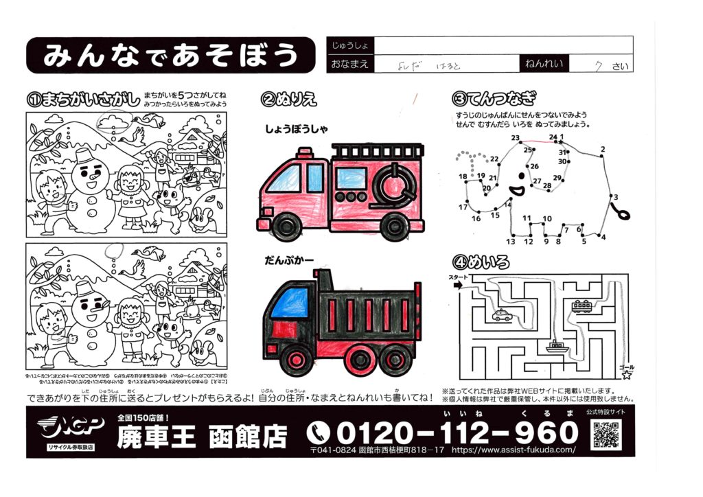 2022年5月14日 / 最終更新日時 : 2022年5月14日 fukuda-admin ぬりえキャンペーン よしだはるとちゃん(7さい) ダンプカー格好いいね…!いいカラーリングだね、一生懸命塗ってくれてありがとう!最近はツートン(2色)の車も多いからぜひ探してみてね!CH-RとかN-BOXとか… コメントを残す コメントをキャンセルメールアドレスが公開されることはありません。 * が付いている欄は必須項目ですコメント 名前 * メール * サイト 上に表示された文字を入力してください。