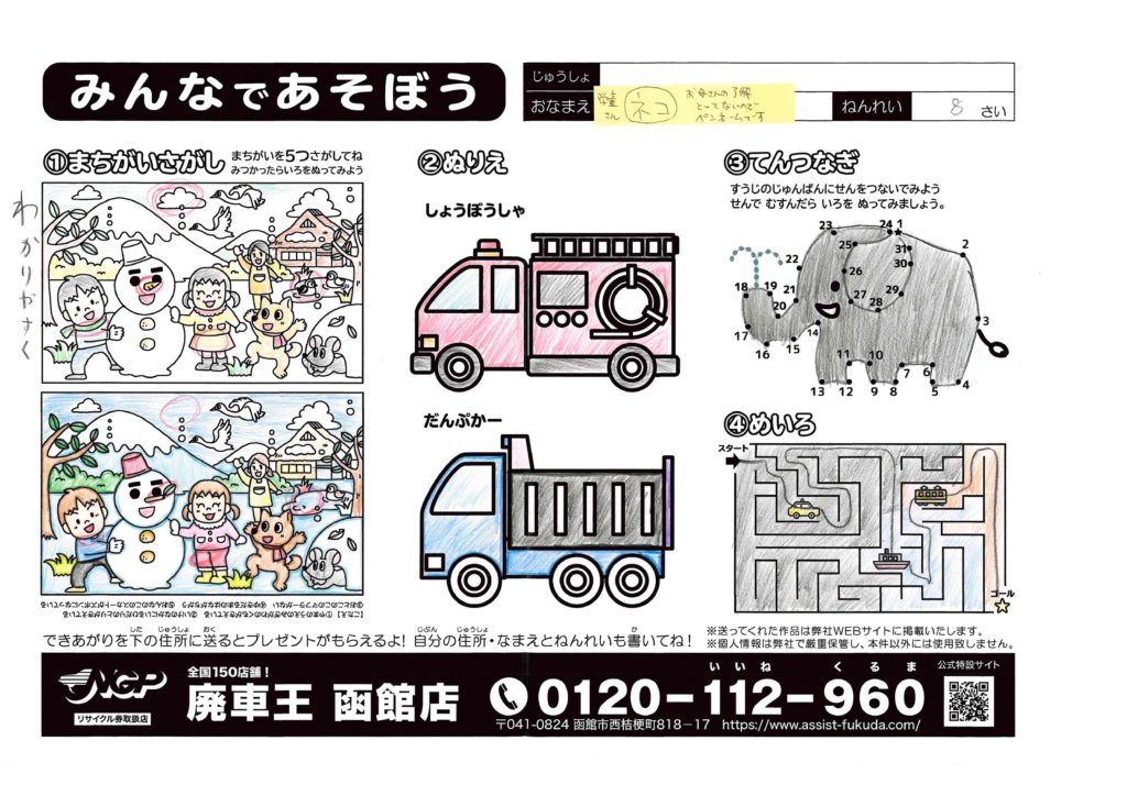 縁取りちゃんとしてて本当に綺麗!まちがいさがしわかりやすくしてくれてありがとう…見る人への気配りが素敵!めいろが車と船と電車で道が塗り分けられてていいね!そしてぞうさんの塗りが綺麗!最高です!またネコちゃんの作品みたいな、参加してくれてありがとう!