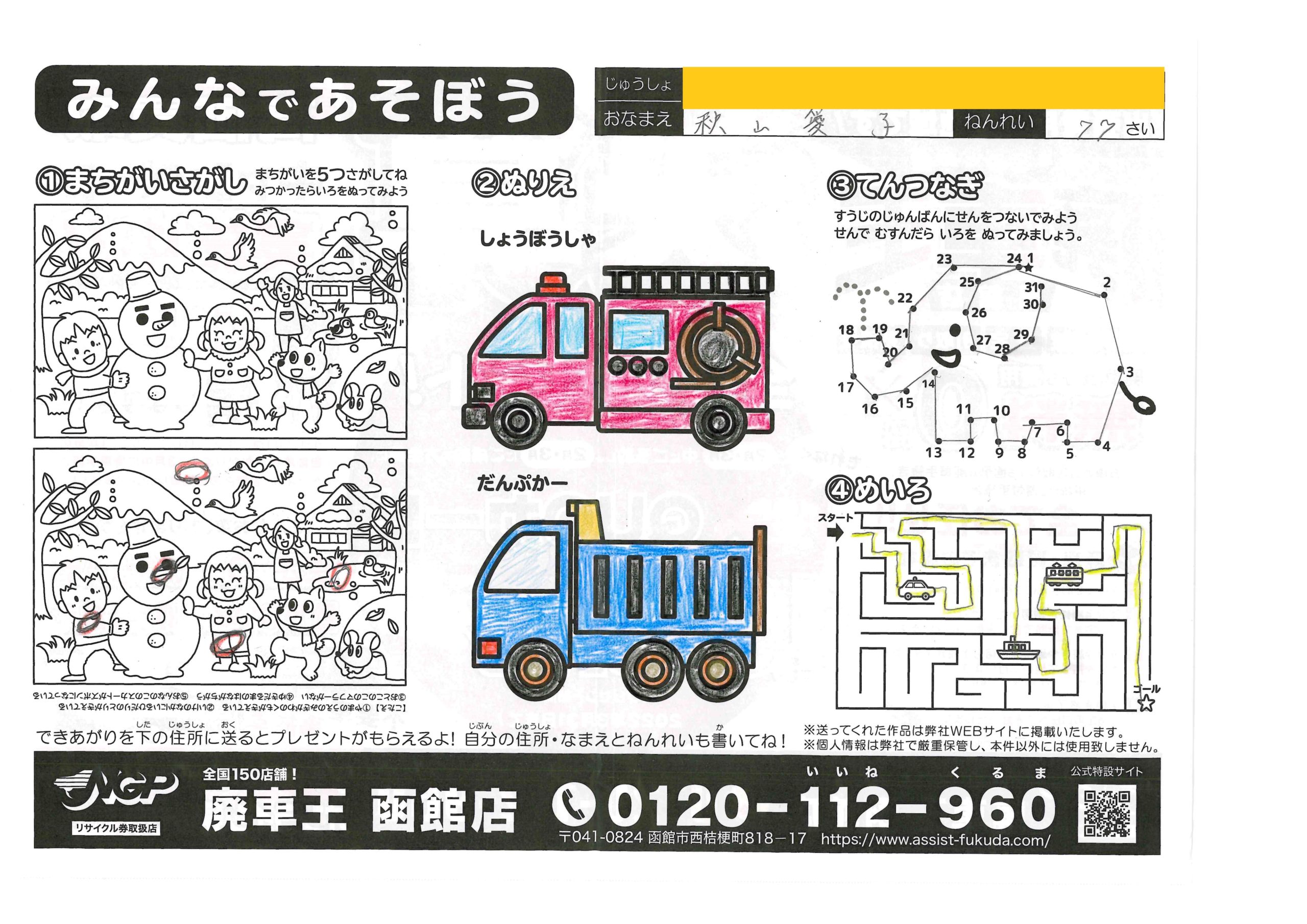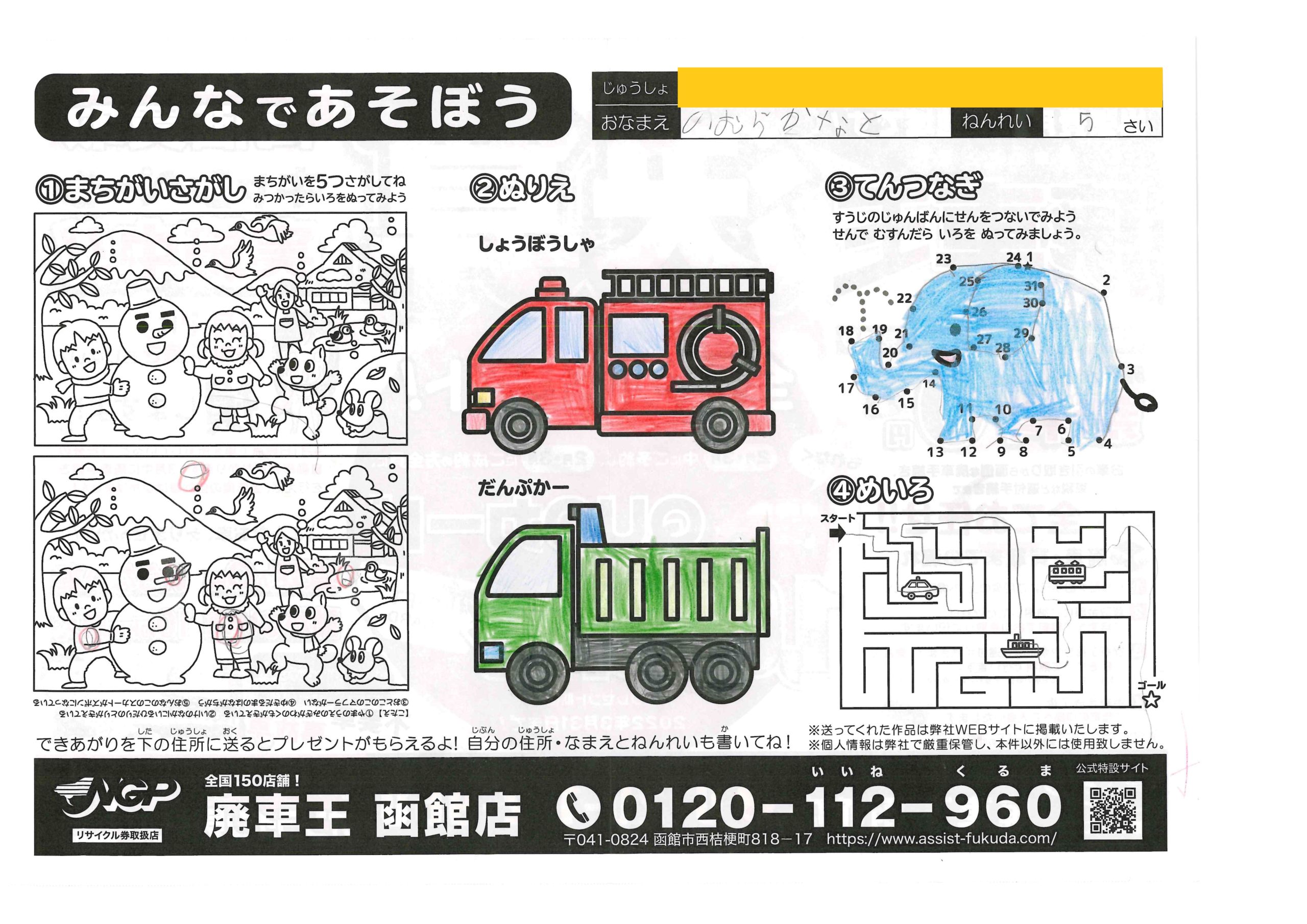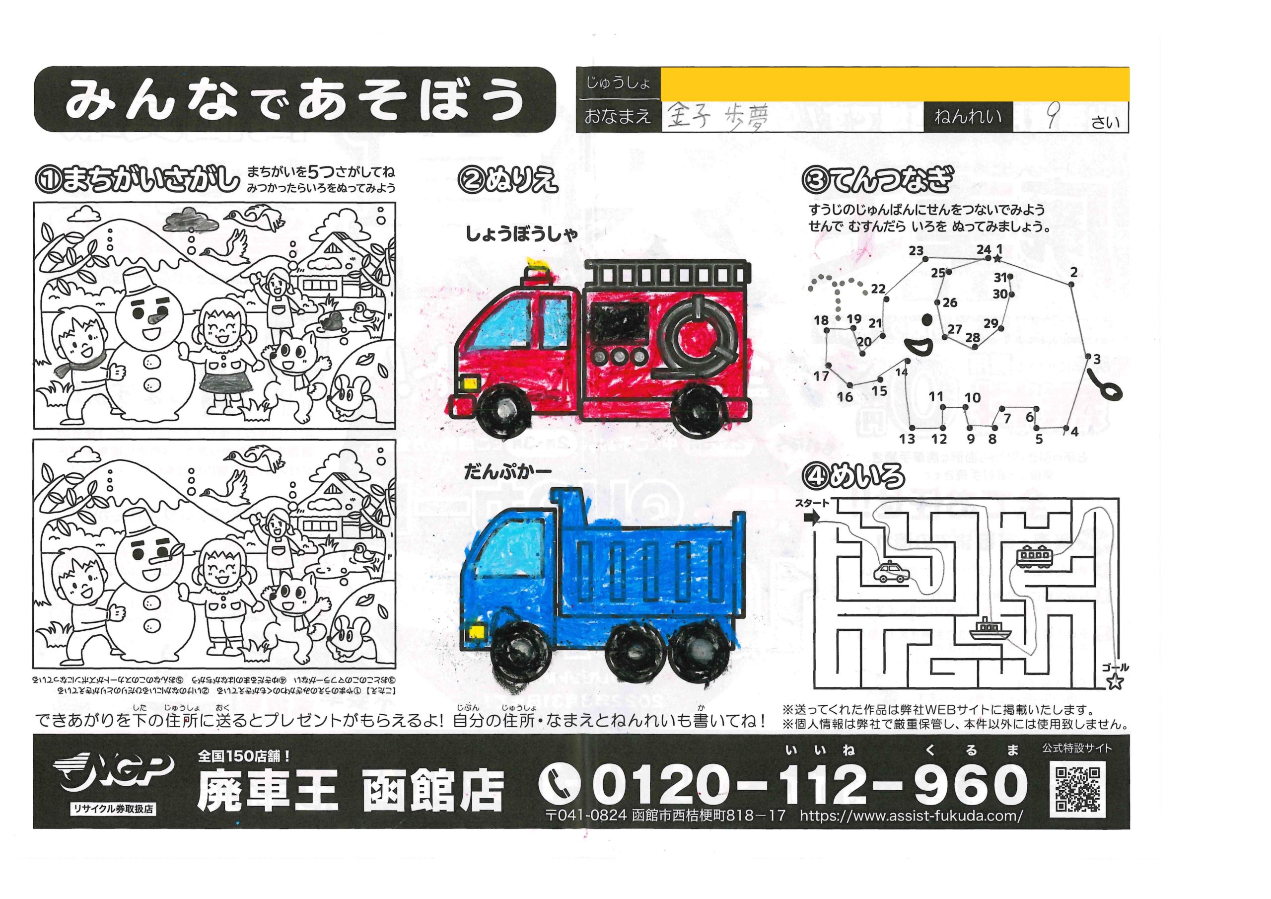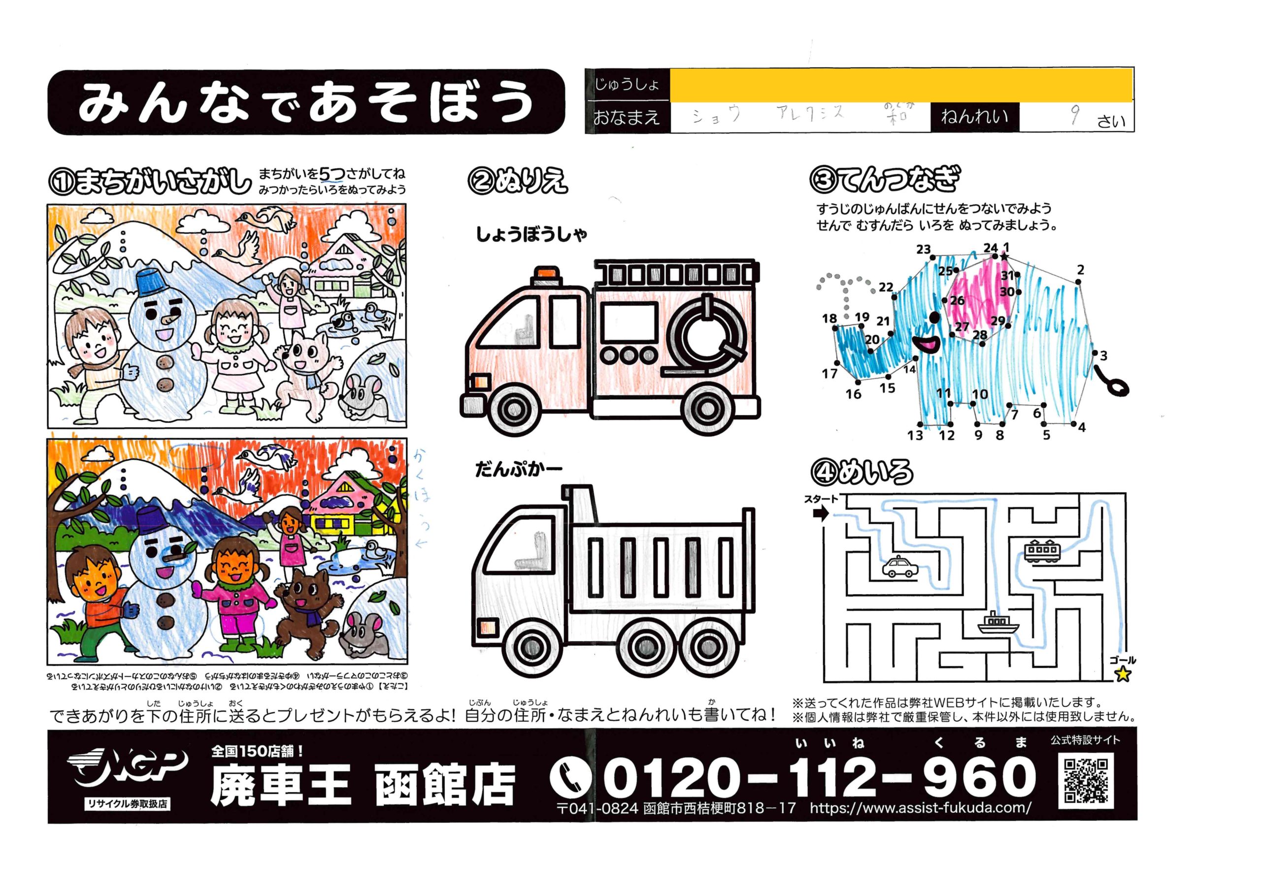 松本たくとちゃん(7さい) 2022年3月17日2022年3月17日 あかい象さんかわいいね!しっかりした塗りが力強くていいね! 秋山愛子ちゃん(77さい) 2022年3月17日2022年3月17日 ダンプカーのカラーがおしゃれです、丁寧に塗っていただきありが… ショウアレクシス和ちゃん(9さい) 2022年3月15日2022年3月15日 ぞうさんかわいい色してるね、同じ方向に塗ってあるのが綺麗に見… 桜岡和枝ちゃん(67さい) 2022年2月28日2022年2月28日 第一弾も参加ありがとうございます!うぐいす色の鉛筆が綺麗です… ゆうたちゃん(7さい) 2022年2月28日2022年2月28日 明るいおうちがいいね!綺麗にぬってくれてありがとう! のむらかなとちゃん(5さい) 2022年2月28日2022年2月28日 ぞうさんかわいく塗ってくれてありがとう!車もとっても綺麗だね… さきちゃん(3さい) 2022年2月28日2022年2月28日 ゴールかいてくれてありがとう、シンプルですっきりしてていいね… 金子歩夢ちゃん(9さい) 2022年2月21日2022年2月21日 クレヨンが鮮やかでいいね!元気な作品をありがとう! 及川千宙ちゃん(8さい) 2022年2月21日2022年2月21日 2回目の参加ありがとう!(1回目お名前の読み方間違えててごめ… ← 前へ 1 … 22 23 24 … 34 次へ →