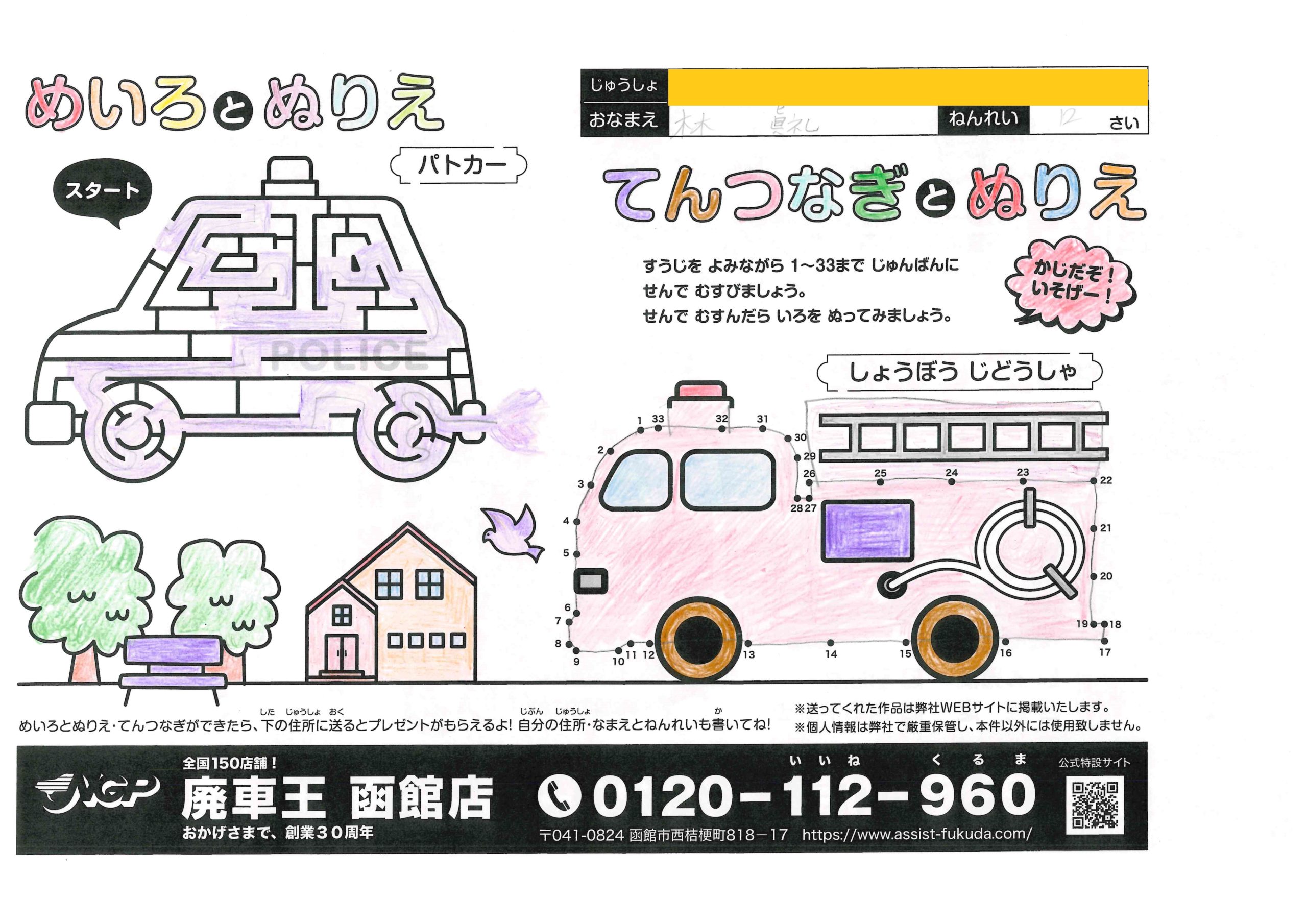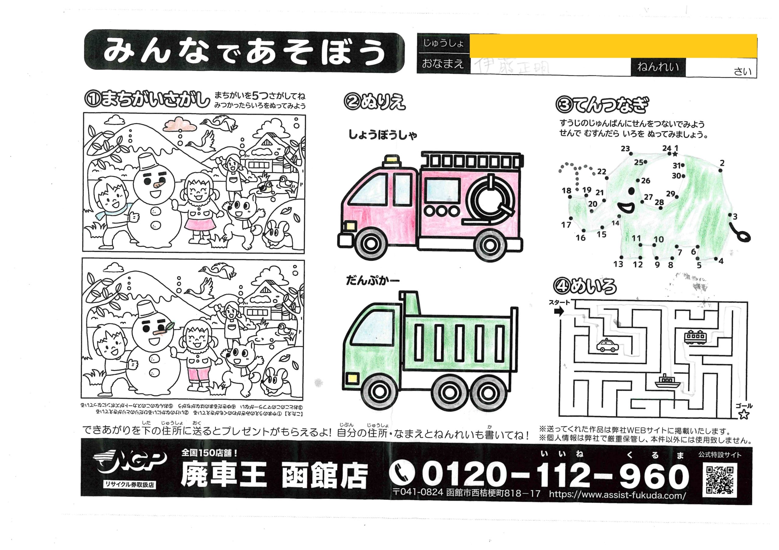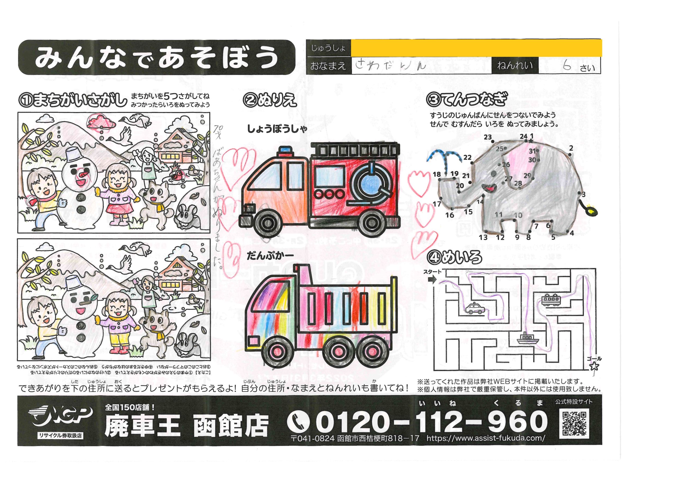 佐々木昭ちゃん(80さい) 2022年2月15日2022年2月15日 第二弾も参加ありがとうございます!色選びがとても綺麗です、和… 岩佐こなたちゃん(8さい) 2022年2月15日2022年2月15日 ペンでの塗りが印刷したみたいな仕上がりだね!象さん綺麗だなあ… 伊藤正明ちゃん(?さい) 2022年2月15日2022年2月15日 応募してくれてありがとう!塗り方がとっても綺麗だね、ダンプカ… たちかわしゅうやちゃん(5さい) 2022年2月15日2022年2月15日 クレヨンの色塗りが力強いね、だんぷかーがちゃんと土運んでて細… さわだりんちゃん(6さい) 2022年2月15日2022年2月15日 今回も参加してくれてありがとう!色塗りぐっと上手になったね、… ここから第二弾! 2022年2月15日2022年2月15日 まちがいさがしとぬりえ、てんつなぎとめいろだよ! 蠣崎然ちゃん(13さい) 2022年1月15日2022年1月15日 蠣崎ちゃん二人ともレベルが高くて感動…!綺麗に仕上げてくれて… 蠣崎そなちゃん(10さい) 2022年1月15日2022年1月15日 迷路の線が正確…!縁取りもしてあって美しい仕上げです…素敵! 林真礼ちゃん(12さい) 2022年1月15日2022年1月15日 綺麗な紫色が印象的だね!塗り方がとても綺麗、ありがとう! ← 前へ 1 … 25 26 27 … 34 次へ →