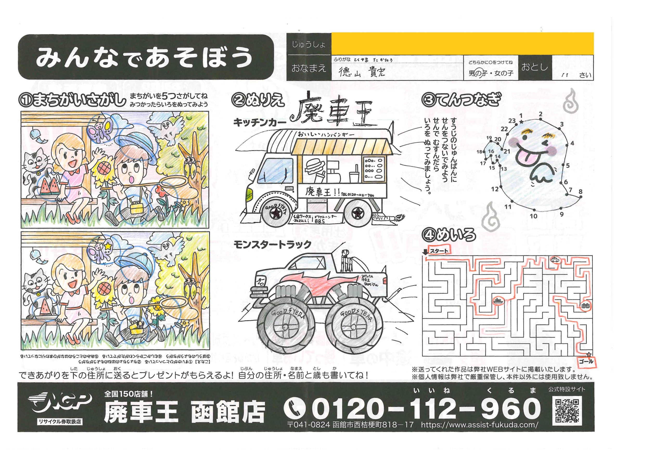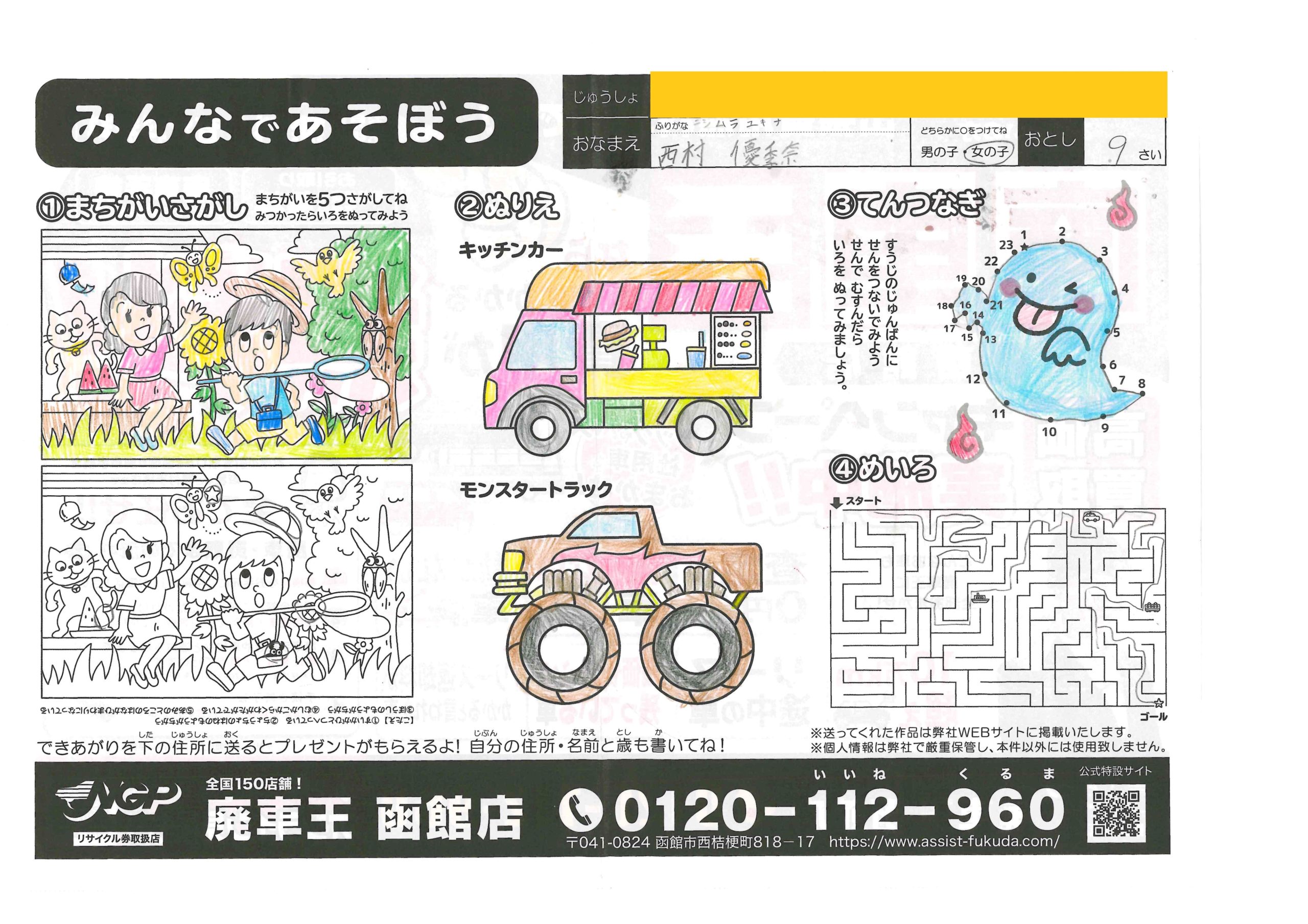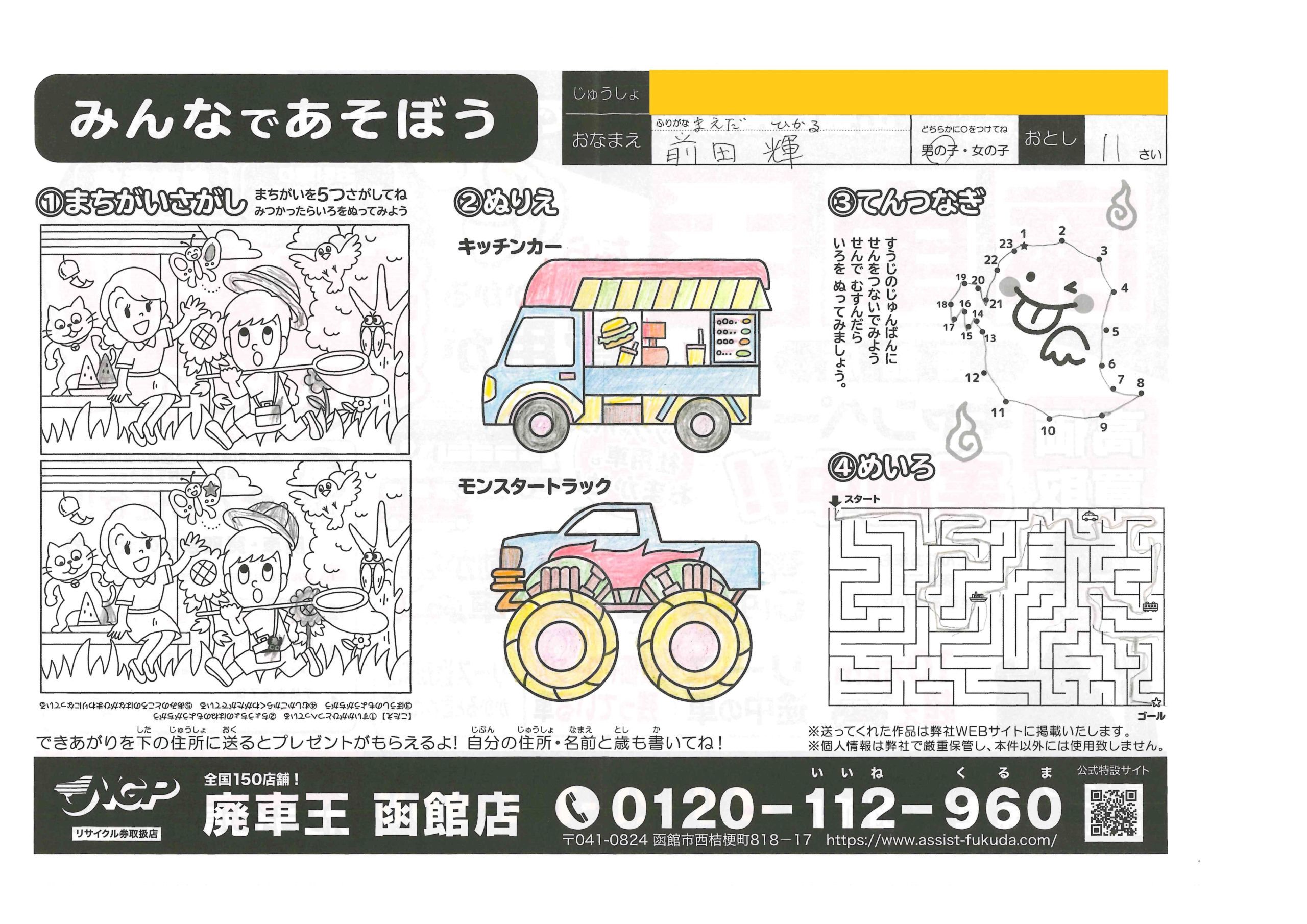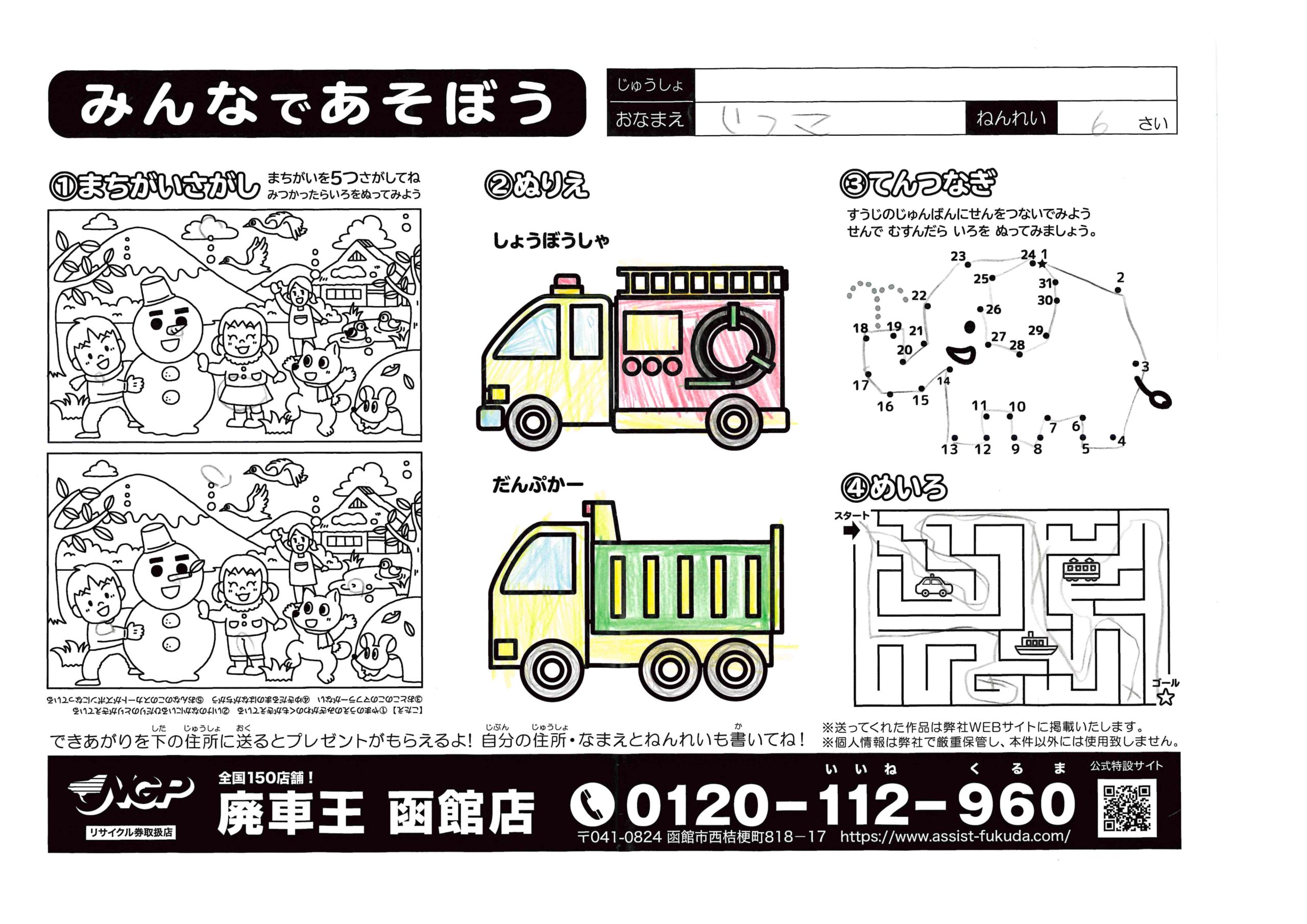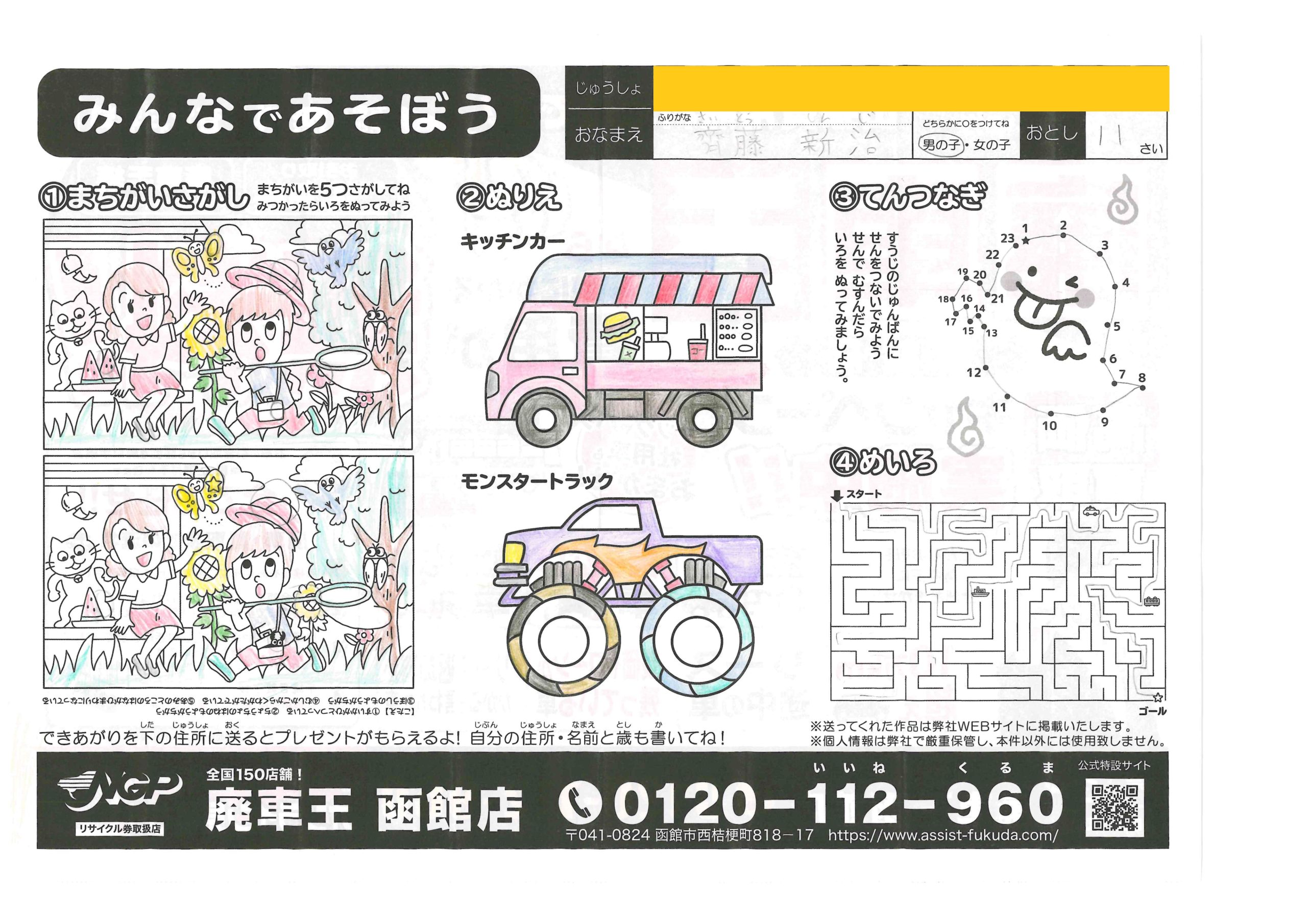 りつこちゃん(6さい) 2022年10月11日2022年10月11日 お名前間違ってたらごめん!きみどり色が綺麗だね、赤とのコント… 德山貴宏ちゃん(11さい) 2022年10月11日2022年10月11日 君は車に詳しいね…?デカールが素晴らしい!キッチンカーが廃車… 齊藤新治ちゃん(11さい) 2022年10月11日2022年10月11日 初参加でいいかな、塗り方めちゃめちゃ綺麗だね?濃淡がとっても… 池田稀咲ちゃん(8さい) 2022年10月11日2022年10月11日 3回目の参加ありがとう!運転手描いてくれてありがとう、カラフ… 前田輝ちゃん(11さい) 2022年10月11日2022年10月11日 初参加ありがとう!おもちゃな感じの色使いめちゃめちゃ可愛いね… 西村優季奈ちゃん(9さい) 2022年10月11日2022年10月11日 初参加ありがとう!水色のおばけ可愛いねえ、キッチンカーがキャ… 星加篤乃ちゃん・千鶴ちゃん・朝花ちゃん(7・7・3さい) 2022年10月11日2022年10月11日 4回目の参加ありがとう!いつもみんなで塗ってくれるから嬉しく… 小野楓ちゃん(11さい) 2022年10月11日2022年10月11日 5回目の参加ありがとう、常連ちゃんいらっしゃい!第1弾からい… 山本倖那ちゃん(5さい) 2022年10月11日2022年10月11日 初参加ありがとう!この帽子のカラーは怪物くんを思い出すね…と… ← 前へ 1 … 3 4 5 … 34 次へ →